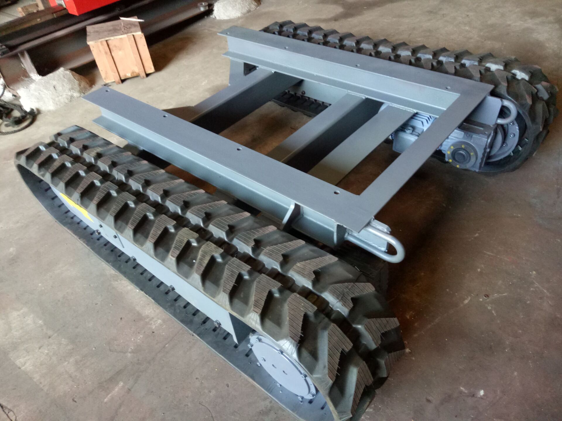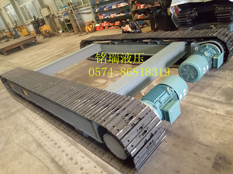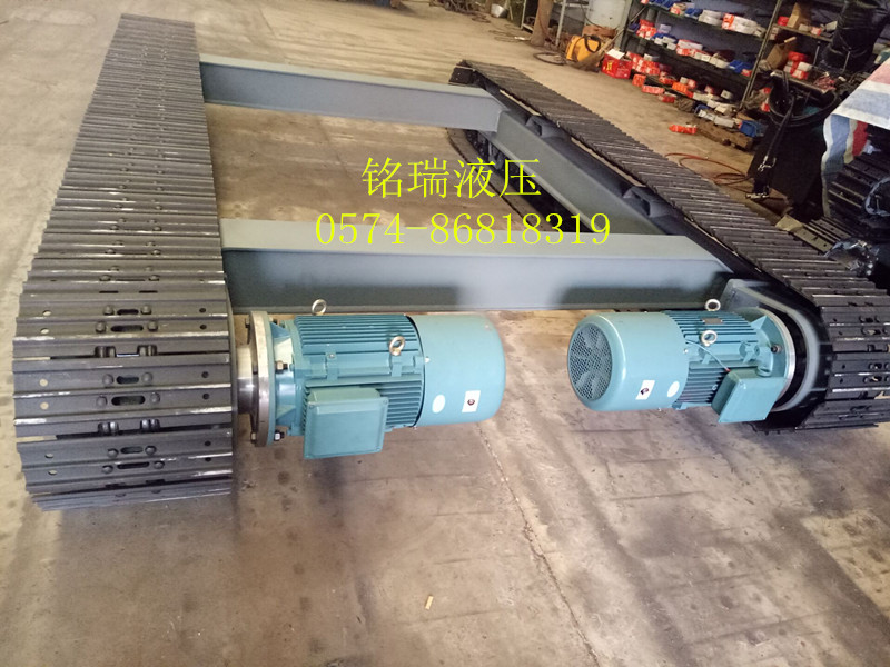 • 電機履帶底盤:承載3-120噸不等,可根據(jù)客戶要求定做,橡膠履帶或鋼履帶底盤,交流電機帶減速機驅(qū)動,外形尺寸可根據(jù)客戶主機量身設(shè)計生產(chǎn)。